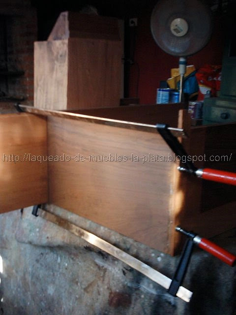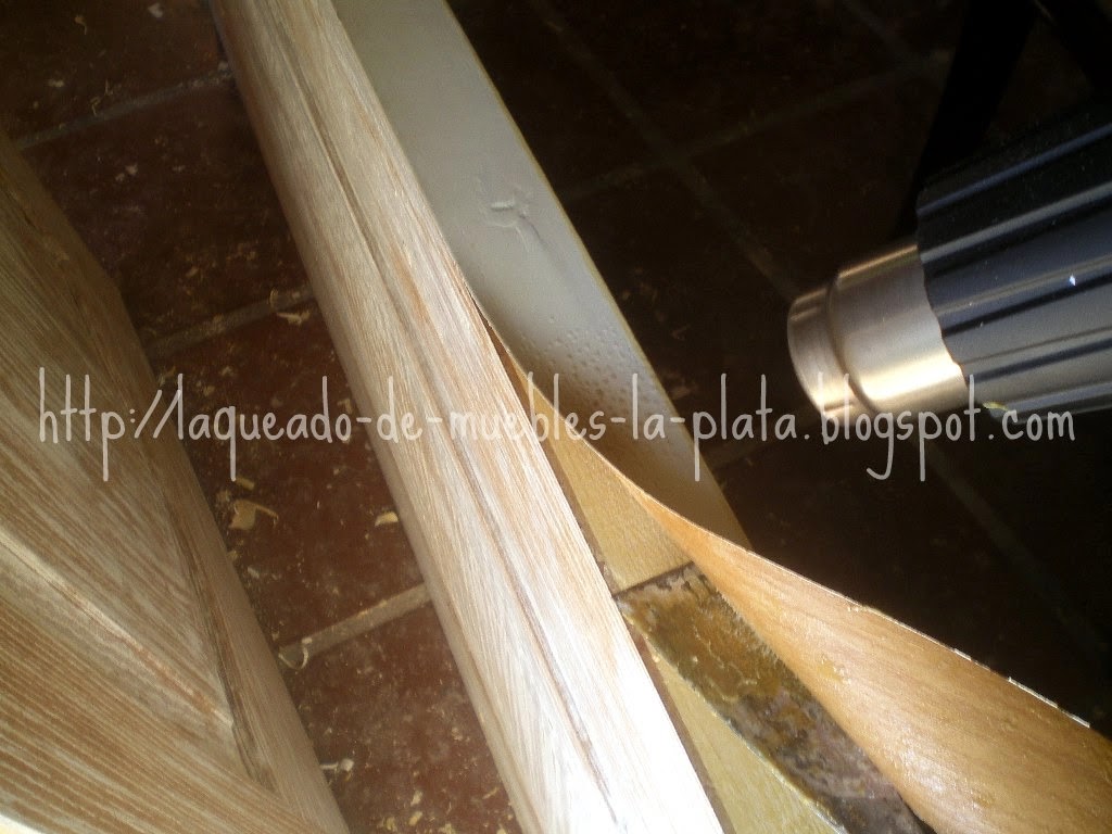 Para quitar el enchapado viejo se puede hacer con pistola de calor como en la siguiente foto. En ese momento yo no tenía la pistola de calor, creo que lo que hice fue mojar la chapa e ir levantándola con un formón, primero lijarla para que el agua penetre en la chapa de madera.