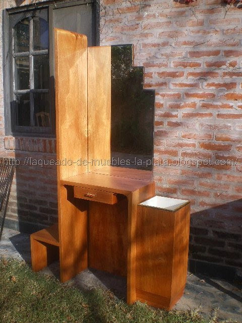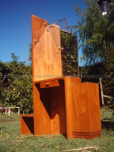 El mueble está sin teñir, conservando el color cedro de la chapa. La terminación es con barniz poliuretánico mate, a pincel. Es un barniz que compré en la pinturería, porque en ese momento no tenía la pistola de pintar y el compresor.