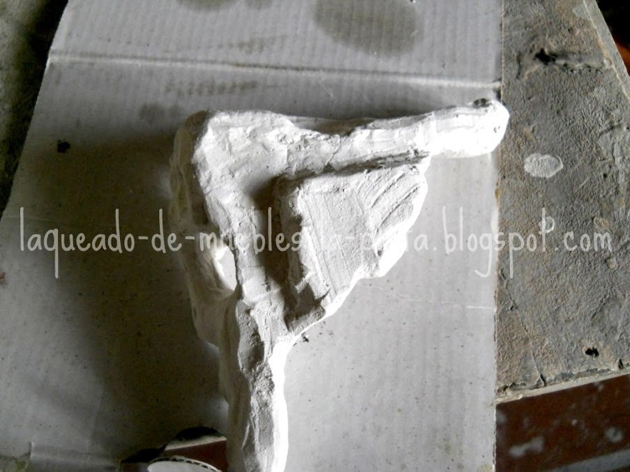 Primero, cuando vi las molduras copiadas fue muy preocupante el golpe de vista, recién salidas del molde no concordaban con mi expectativa de lo que es una moldura en un marco. Me parecieron muy desprolijas y pensé que iba a tener que empezar de nuevo, dado que ya había empezado me arriesgué a seguir y emprolijarlas con una gubia.