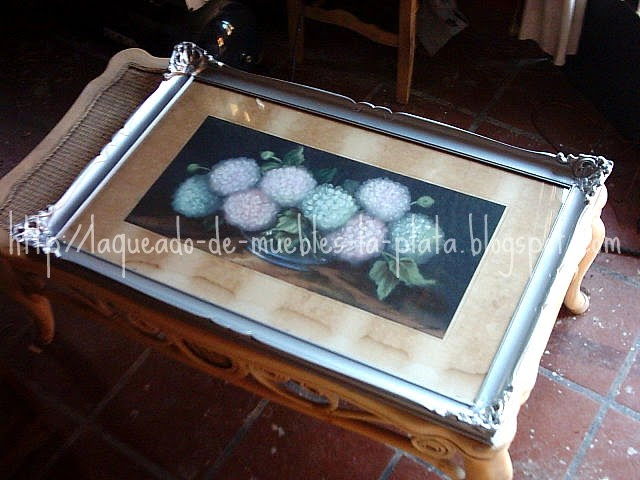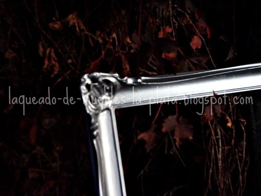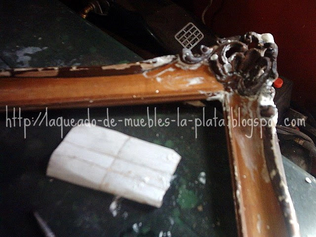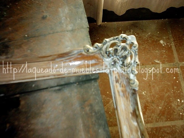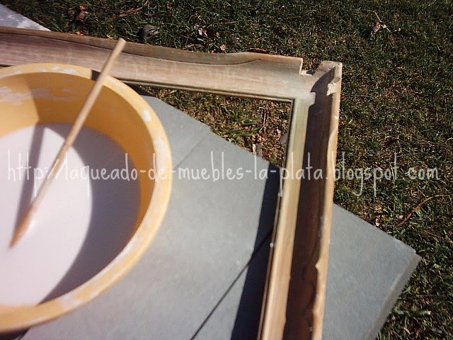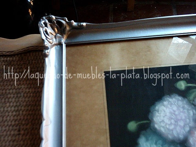 La terminación puede hacerse con goma laca o cualquier pintura o esmalte que uno elija. El marco lo pinté para que haga juego con dos sillones del mismo cliente, aquí se ve el trabajo, es la misma pintura.
