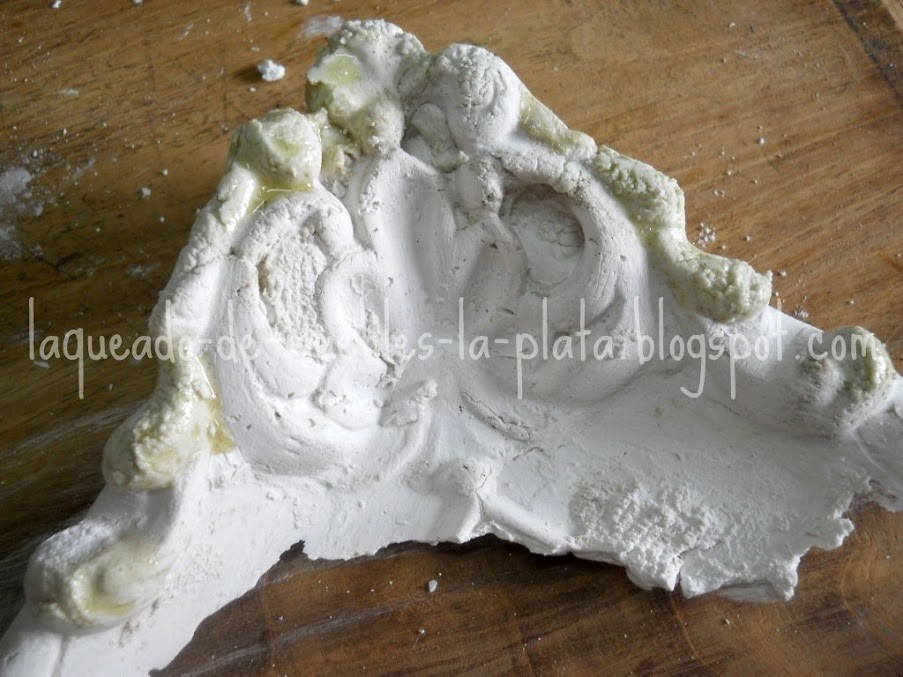 Para la terminación la capacidad absorbente del yeso jugará a nuestro favor. Cuando las molduras absorben la laca o pintura estas ganan muchísima dureza. Entonces debemos dejarlas secar en un lugar ventilado por unos días antes de laquear el trabajo.