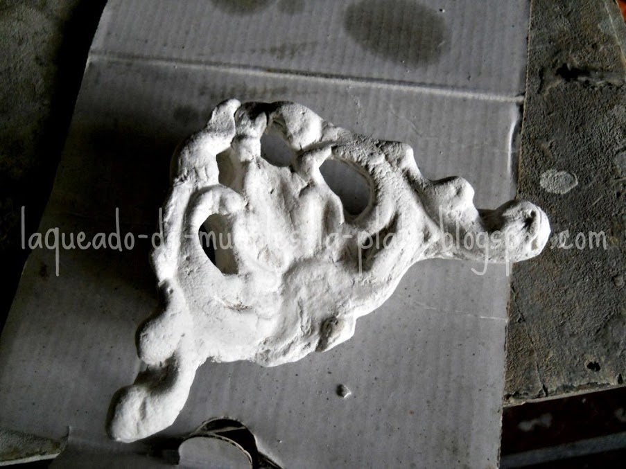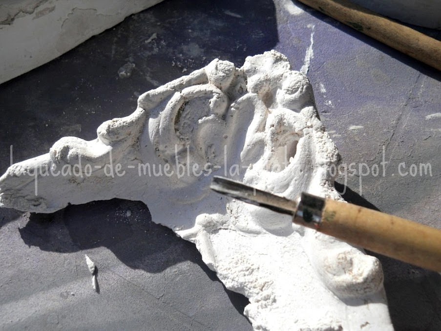 Fueron quitadas todas las partes sobrantes de yeso, descubriendo la moldura. En la parte de atrás se ve la forma que le tuve que dar para que apoye bien en la madera.