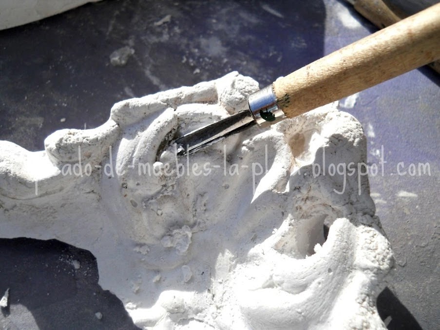 Usar una herramienta para tallar, como una espátula, formón, lama, gubia y lijas. Esto lo hice antes de que el yeso seque por completo, en esa instancia sería muy quebradizo, antes de que termine de secar puedes quitar material fácilmente sin hacer tanta fuerza.