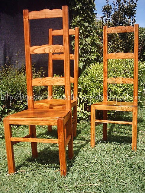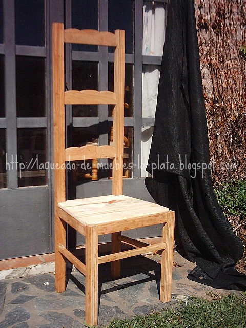 Las sillas están sin teñir, solo la parte de pino que agregué está teñida. Para el lustre usé sellador nitrocelulosico, sin laca nitrocelulosica. Están pintadas a pincel, el sellador nitro se puede dar a pincel pero la laca no tanto.