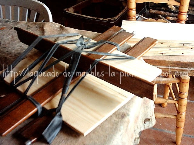 Con la cámara de bicicleta se ejerce tensión. Amarrar en una de las maderas auxiliares, envolviendo las piezas a encolar. Hacer un nudo entre las 3 maderas auxiliares, tensando lo mas posible. Finalmente con una 4 madera auxiliar aumentar la fuerza, esta la puse después de tensar y atar las gomas para aumentar la presión.