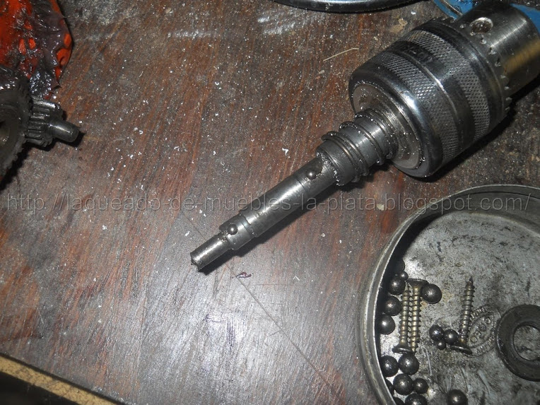 Cuando desarme esta parte prestar especial atención a las municiones que fijan el eje a los engranajes, son dos pequeñas esferas de acero que hacen posible que la fuerza de rotación del motor se transmita al eje del mandril, facilitando también que el eje del motor y el mandril puedan desmontarse fácilmente. Si se pierden el motor gira pero mandril no.