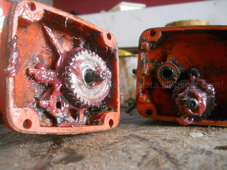 Aplicar a los engranes ya limpios grasa de litio, disponible en cualquier ferretería. Si te pasas con la grasa no va a haber problema, esa parte donde van los engranajes es espaciosa y la grasa no es liquida como para pasarse a la parte eléctrica y hacer un corto ni nada.