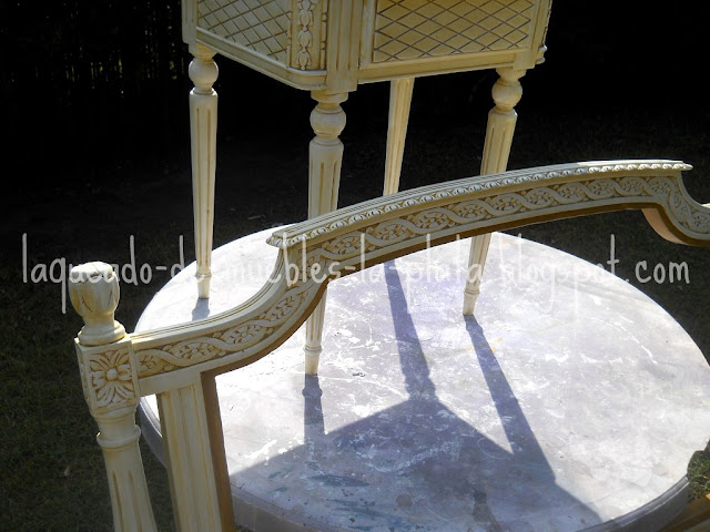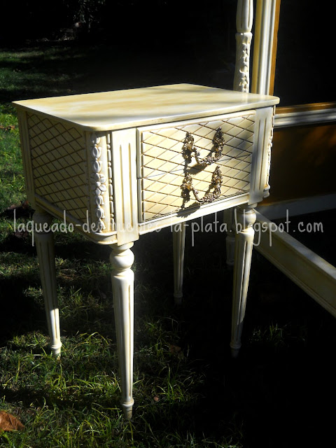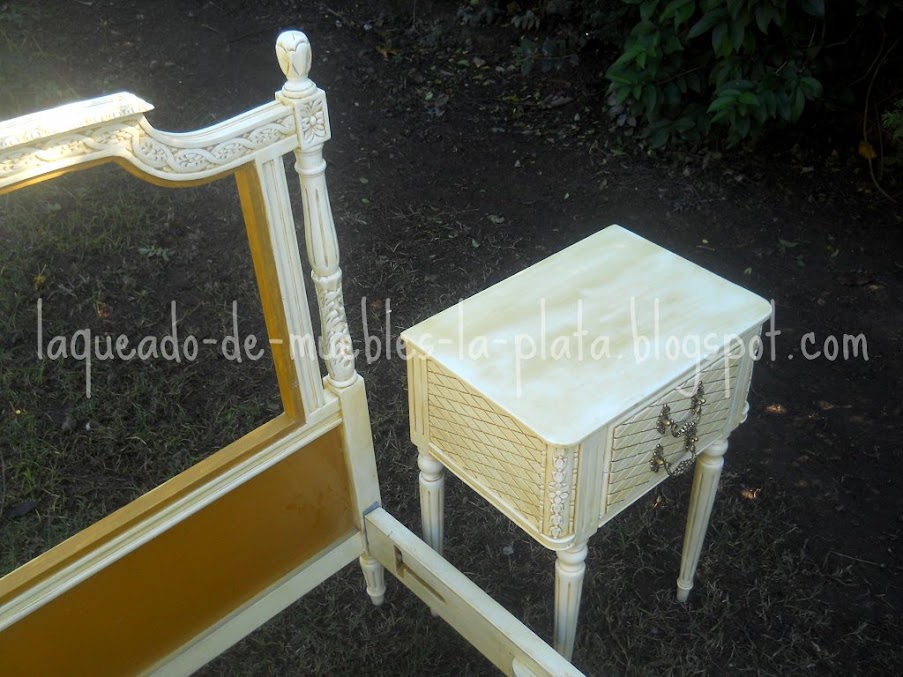 Los muebles, una cama y mesa de noche, tenían originalmente una patina, aparentemente una patina dorada echa con purpurina sobre fondo blanco.