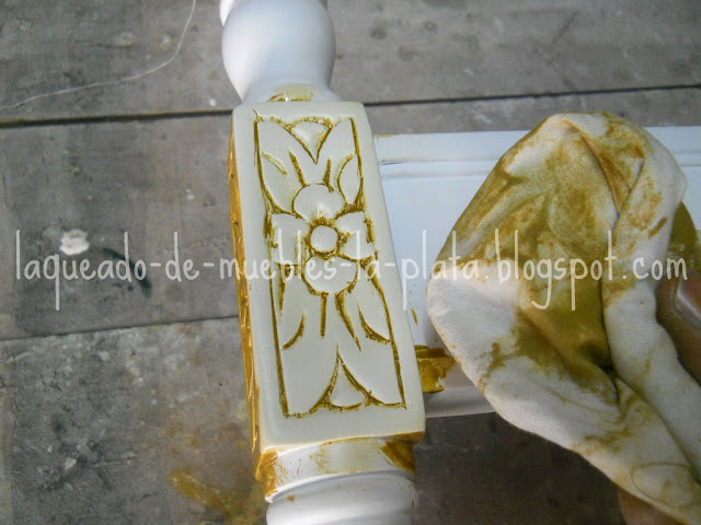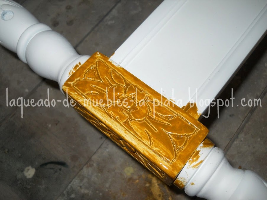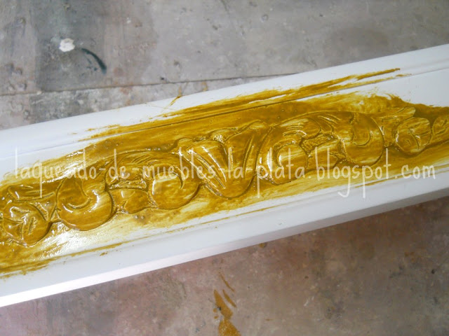 Esto es lo que saqué de hablar en el negocio en mi ciudad, recuerdo que al explicar el tema de la patina me dicen que el esmalte sin diluir agarra bien al blanco bi-capa y luego el poliueretanico lo mismo. Y que si usara algún diluyente sobre la patina se me iban a mesclar las dos pinturas, el blanco y el dorado.