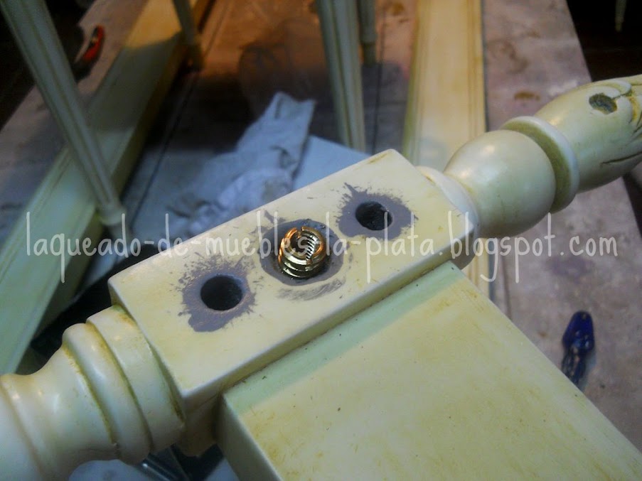 Yo no quise andar haciendo adaptaciones así que usé adhesivo epoxi para fijar los tirafondos que van en este tipo de camas, sumado a que lo hice enroscar mas adentro con el agujero del diámetro original. Lo dejé en manos del dueño de la cama, si llegara a desprenderse, cambiar al otro sistema.