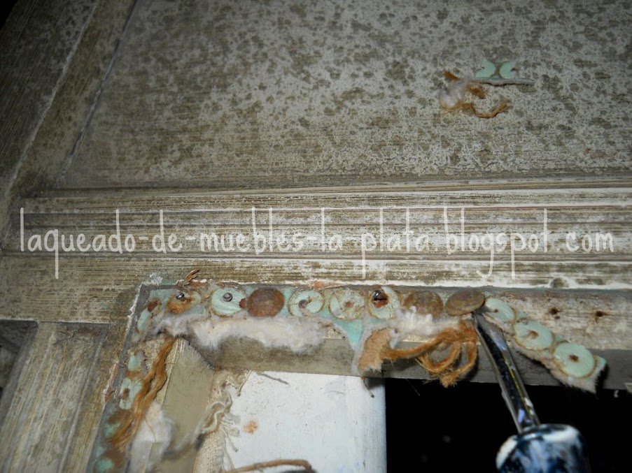 Retiramos las tachuelas viejas y el tapizado de la cabecera. Retiramos los herrajes.