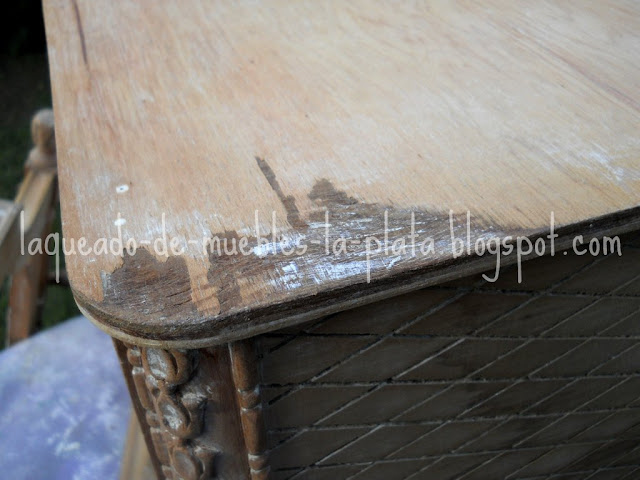 En la mesa de noche el enchapado estaba levantado en una parte, dado que la terminación será no transparente podemos enmasillar esa parte sin problemas de color.
