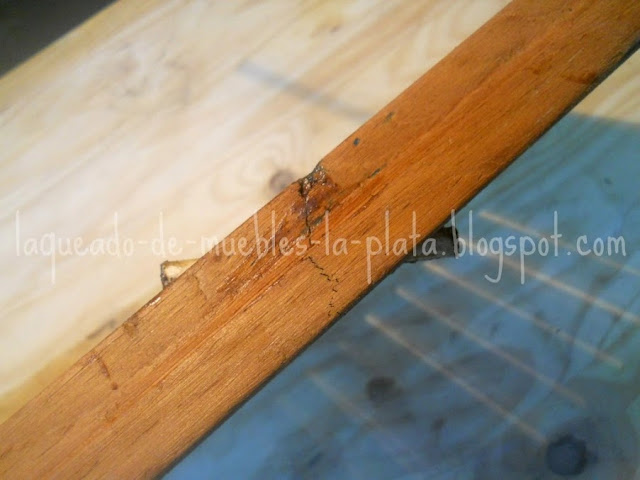 Encolar las piezas sueltas, enmasillar imperfecciones con masilla para madera (en este caso color cedro).