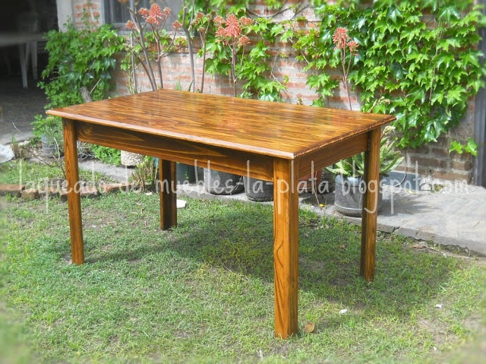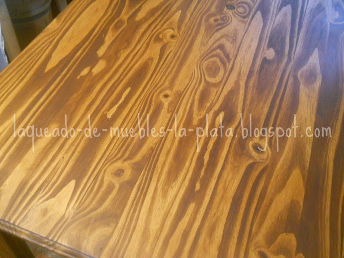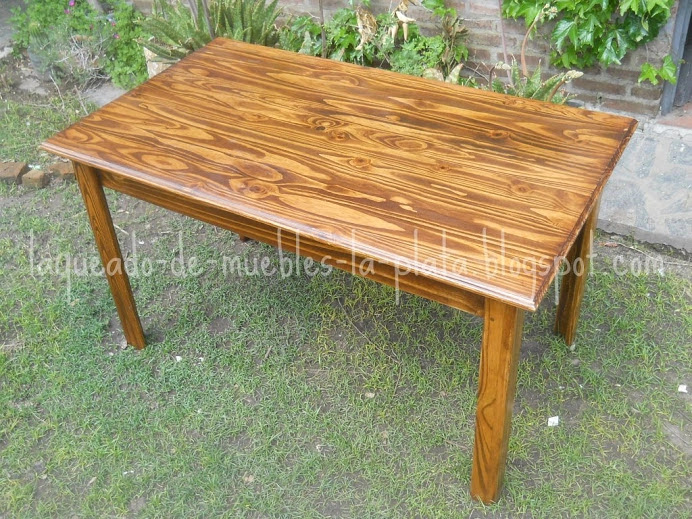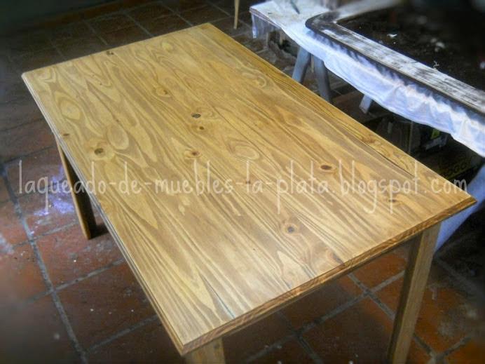 Aquí esta el trabajo terminado. Una mesa de pino teñida color nogal con lustre de laca acrilica.