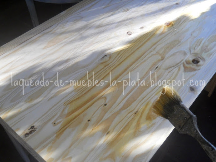Ahora para secar la madera y facilitar la absorción del tinte aplicamos thinner con un pincel, esto lo hago para quitar las resinas. De todas formas no recuerdo si usé lavandina y no thinner, para resaltar le veta, secar y blanquear la madera; para que el teñido tenga mayor protagonismo.