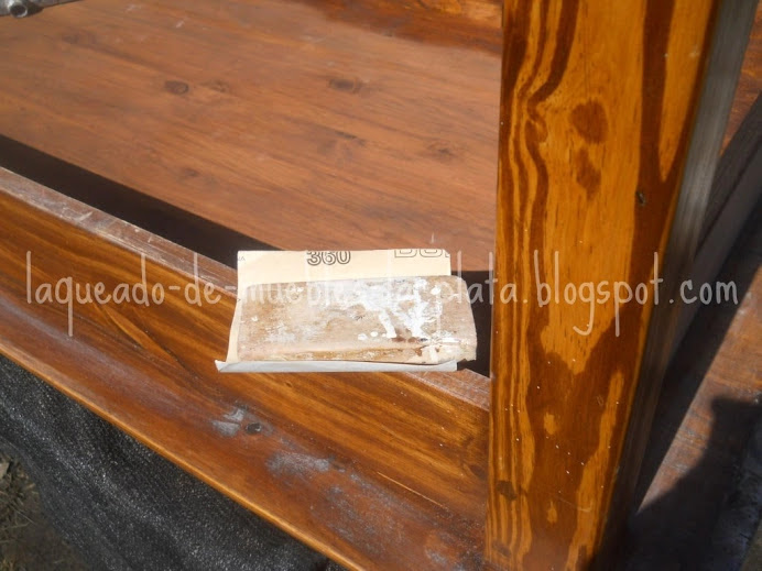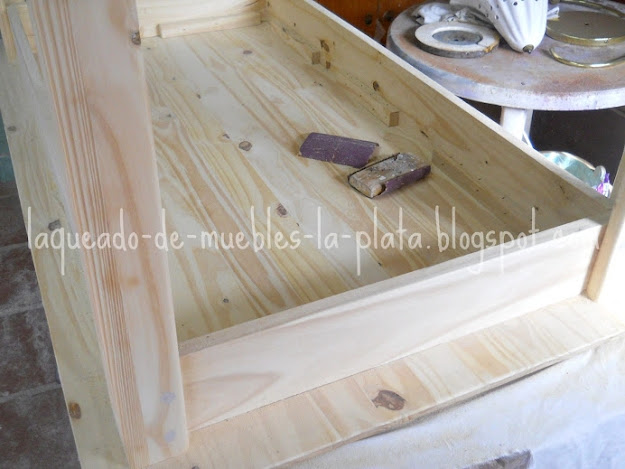 Lijar todo el mueble con lija para madera numero 80, luego 100 y finalmente lija anti-empaste 120. Trabajando en el sentido de la veta de la madera.