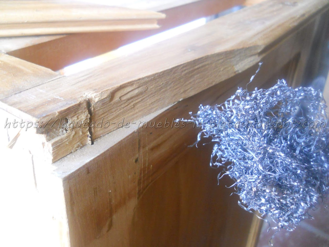 Para re-encolar una parte así se limpia con viruta gruesa de acero. Frotando con paciencia para limpiar bien las maderas a encolar. Limpiamos el polvo.